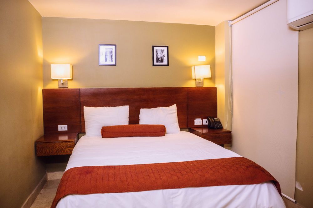 Habitación Estándar con 1 cama Queen size,capacidad máxima 2 personas aire acondicionado, pantalla con servicio de T.v. por cable, internet inalámbrico, agua caliente las 24 hrs. del día, artículos de higiene personal, vista interna.